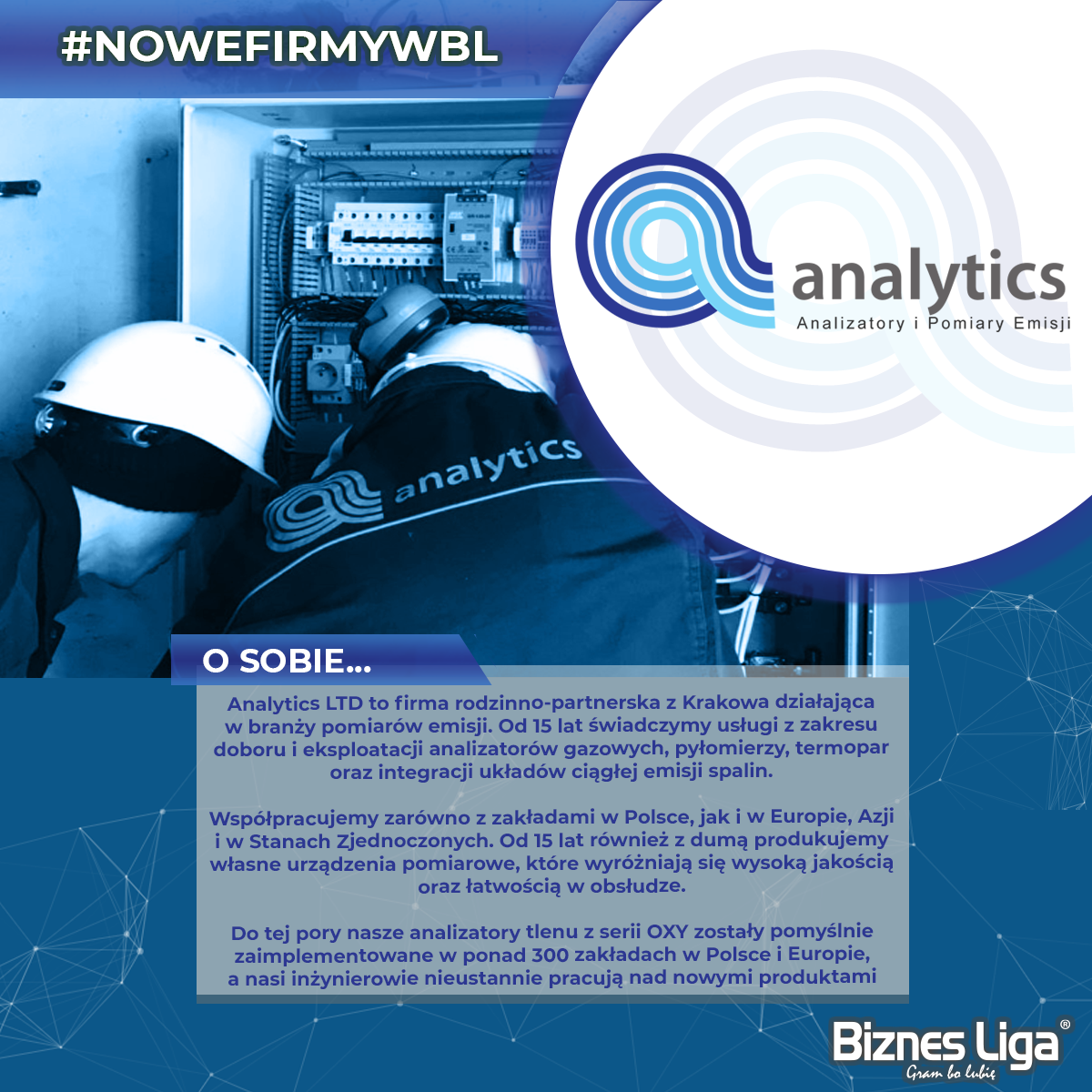 Analytics LTD to firma rodzinno-partnerska z Krakowa działająca w branży pomiarów emisji. Od 15 lat świadczymy usługi z zakresy doboru i eksploatacji analizatorów gazowych, pyłomierzy, termopar oraz integracji układów ciągłej emisji spalin. Współpracujemy zarówno z zakładami w Polsce, jak i w Europie, Azji i w Stanach Zjednoczonych. Od 15 lat również z dumą produkujemy własne urządzenia pomiarowe, które wyróżniają się wysoką jakością oraz łatwością w obsłudze. Do tej pory nasze analizatory tlenu z serii OXY zostały pomyślnie zaimplementowane w ponad 300 zakładach w Polsce i Europie, a nasi inżynierowie nieustannie pracują nad nowymi produktami.